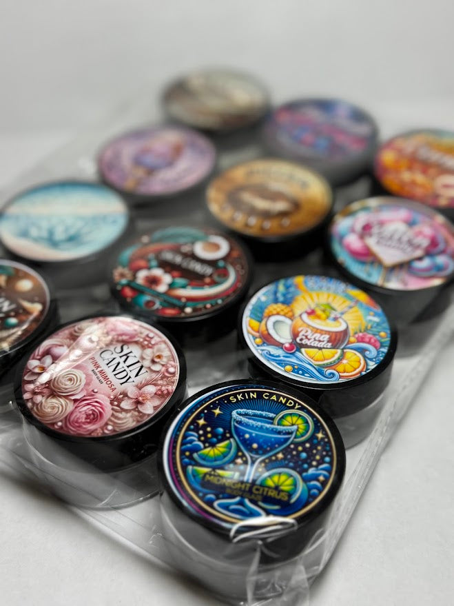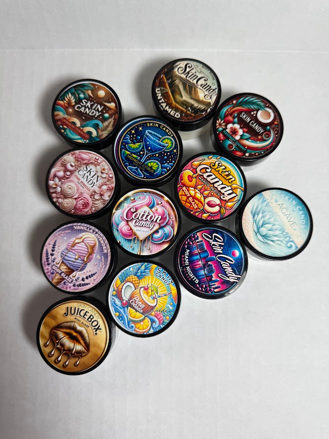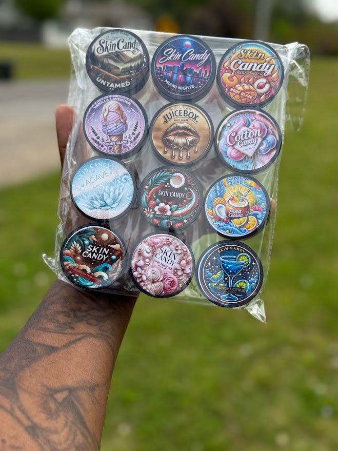 The Skin Candy Body Glaze Sampler Set is a collection of 12 mini whipped body butters designed to deeply moisturize, soften, and enhance your natural glow. Perfect for travel, gifting, or sampling, each 1oz jar leaves your skin silky, shiny, and deliciously scented.